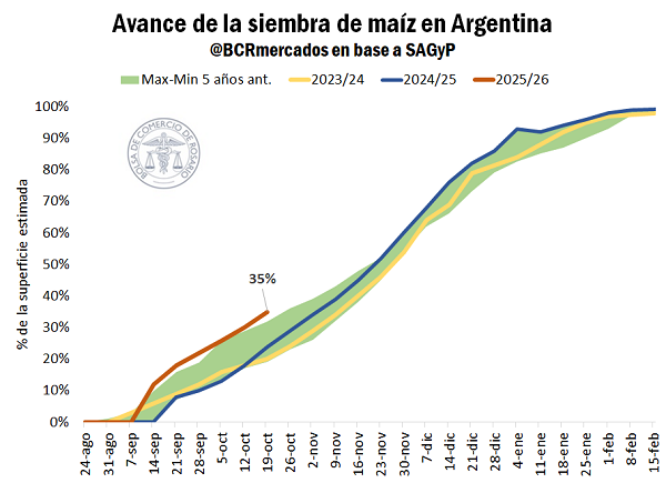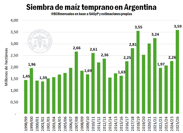 En este contexto, junto con el mes de octubre se va dando por cerrada la ventana de siembra de maíz temprano. Según reporta SAGyP, a la fecha se sembraron 3,59 millones de hectáreas de maíz temprano correspondientes a la campaña 2025/25, un récord histórico.