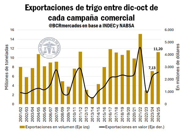 Para finalizar con el trigo, se destaca la robustez del mercado exportador de la segunda mitad de la campaña. En efecto, entre diciembre y octubre se embarcaron 11,2 millones de toneladas, 57% por encima de la campaña anterior y 12% mayor al promedio de los últimos ocho años.