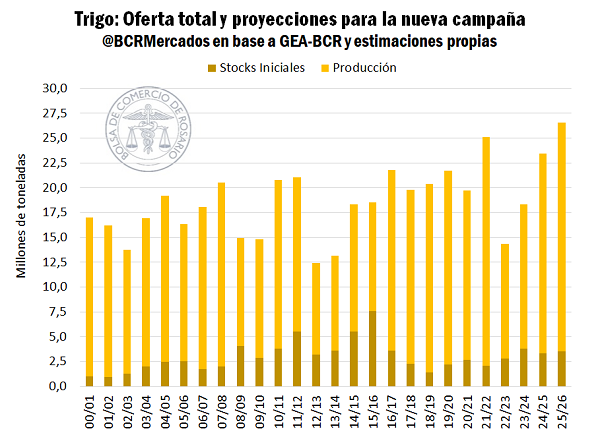 Las condiciones hídricas promedio de los campos argentinos han sido extraordinarias para el desarrollo del trigo implantado. Si bien, lamentablemente los anegamientos en zonas puntuales implicaron pérdida de producción potencial en algunos casos, el general de las condiciones de los cultivos es excelente. En este escenario GEA-BCR (ver) estima una producción de 23 Mt para el ciclo 2025/26, en línea con el récord de la campaña 2021/22.