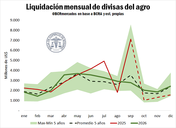 Las proyecciones para el año 2026 ubican la oferta de divisas del agro en el MLC en US$ 31.400 millones, quedando por debajo de la estimación de 2025. Uno de los factores explicativos de esto es precisamente el esquema de eliminación temporaria de DEX, que se espera reduzca la oferta de dólares del sector hasta el empalme con la nueva cosecha 2025/26 producto del adelantamiento ocurrido con la liquidación en septiembre.