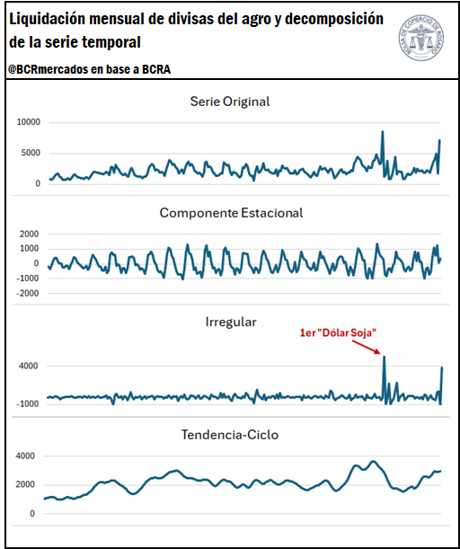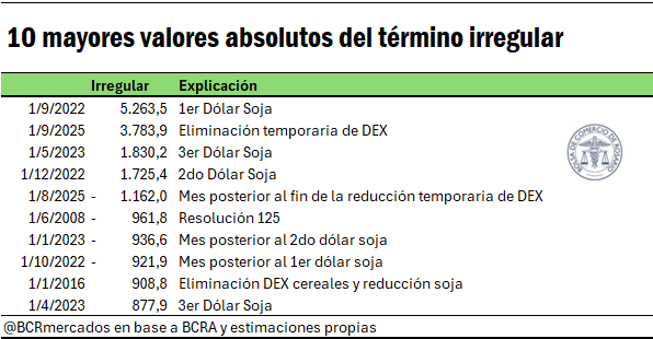 De hecho, observando la serie del componente irregular, de los 10 registros más elevados que arroja la serie desde 2005 a la fecha en términos absolutos, 8 ocurrieron desde el 1er dólar soja a actualidad y se explican por políticas cambiarias o tributarias que cambiaron los incentivos a liquidar dólares: “dólares soja” 1, 2 y 3; reducción temporaria de DEX del primer semestre de 2025; eliminación temporaria de DEX de septiembre 2025.