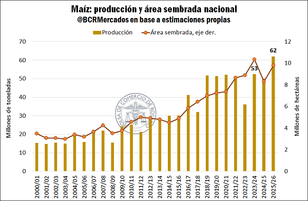 En su último informe mensual, la Guía Estratégica para el Agro (GEA-BCR) proyectó la producción nacional de maíz en 62 millones de toneladas, volumen que marcaría un incremento interanual de 24,1%; y del 18,2% si se compara con el máximo previo del ciclo 2023/24. Detrás de este repunte productivo se destacan, por un lado, un aumento del área sembrada a 9,8 millones de hectáreas, recuperando un 17,7% en comparación con la campaña previa, luego de una merma significativa en la 2024/25 por el temor a la chicharrita. Este guarismo es el segundo más alto del siglo, sólo detrás de la 2023/24 con 10,3 M ha. Más allá de esto, se destaca también una recuperación del rinde promedio nacional a raíz de precipitaciones que se extendieron en gran parte del territorio durante la segunda mitad del 2025, pese a que el escenario se volvió menos favorable a partir del verano. De este modo, se proyecta un rinde promedio de 76,3 quintales por hectárea, un 7,0% superior al de la campaña pasada, y un 10,2% por encima del promedio del último lustro.