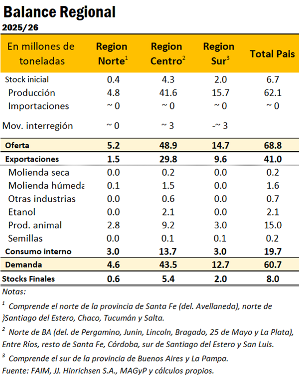 Finalmente, al computar los usos internos del cereal, que engloban principalmente el consumo animal, la molienda y la producción de bioetanol, se alcanza un consumo interno de 3,0 Mt en la Región Norte. Por su parte, la Región Central, que concentra el grueso de la industria de procesamiento y la producción de biocombustibles a nivel nacional, además de un importante consumo animal, absorbería internamente un total de 13,7 Mt. Por último, la Región Sur, apuntalada fundamentalmente por la producción animal, insumiría internamente unas 3,0 Mt. De esta manera, más allá del gran dinamismo exportador, el consumo interno nacional consolidaría un volumen récord de 19,7 Mt, reafirmando su rol fundamental para el agregado de valor en origen.