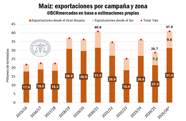 A nivel país, la salida del cereal acumularía un récord de 41,0 Mt, batiendo por poco la anterior marca más alta de 40,9 Mt, en la 2020/21. Asimismo, la comparación entre campañas proyectada arroja que la 2025/26 sería 43% mayor al ciclo anterior.