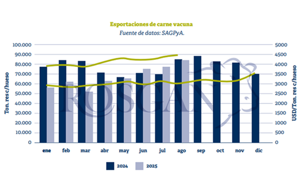 Este escenario interno contrasta con las condiciones del mercado ganadero a nivel global, que presenta una oportunidad excepcional para la expansión y el crecimiento del sector. En este contexto, la semana pasada se dieron a conocer los datos de exportación de carne vacuna correspondientes al mes de agosto, que reflejan una importante recuperación del sector exportador. La reciente reducción parcial de las retenciones, junto con la mejora del tipo de cambio, ha permitido que las exportaciones comiencen a consolidarse en un mercado internacional con alta demanda.