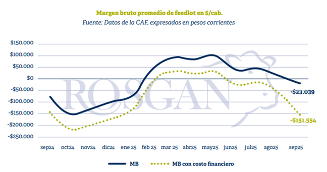 Cabe recordar que los feedlots ya vienen operando con márgenes negativos desde hace varios meses, afectados no solo por una ajustada relación de compra-venta de la hacienda, sino fundamentalmente por el fuerte incremento de tasas financieras que aumenta significativamente el costo del capital de trabajo asociado a este tipo de actividad.