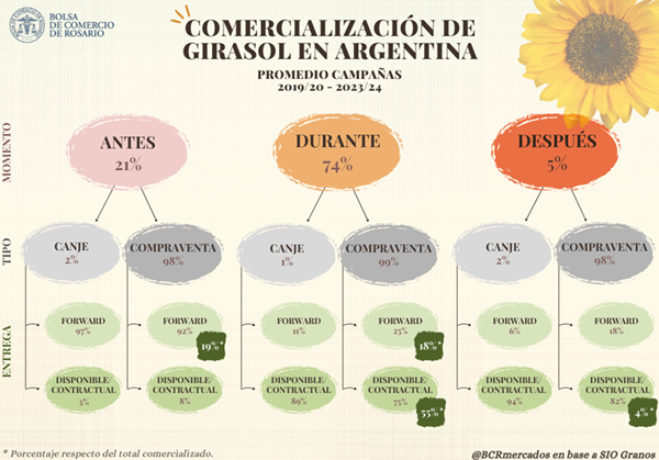 En promedio, el 55% del girasol se comercializa durante la compaña comercial, con contratos de compraventa y con entrega disponible/contractual. La segunda modalidad más utilizada es la mercadería negociada en precosecha, con contratos de compraventa y entrega diferida (19%). Le siguen, en orden decreciente de importancia, las operaciones de girasol durante la campaña, bajo contratos de compraventa y con entrega forward (18%), y la mercadería negociada una vez finalizada la campaña, bajo contratos de compraventa y con entrega disponible/contractual (4%).