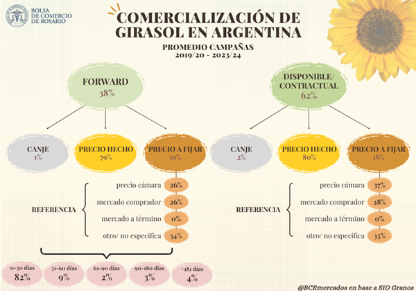 En conjunto, los datos muestran que la mayor parte del girasol comercializado en Argentina se origina en pocas provincias, donde predomina su producción. Asimismo, se negocia mayormente bajo contratos de compraventa durante la campaña y se pacta principalmente a precio hecho y con pago contra entrega.
