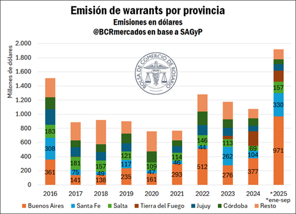 Analizado por provincia, la coyuntura reciente trae cambios muy interesantes. Tomando las emisiones de warrants en dólares, históricamente la provincia que más emisiones ha generado ha sido Buenos Aires. Esta concentra cerca de la mitad de los warrants emitidos en dólares, acumulando además un crecimiento del 158% entre enero y septiembre del 2025 respecto al mismo período del año pasado. Sin embargo, la provincia que más creció en lo que va del 2025 es Santa Fe, con su financiamiento en warrants en dólares subiendo más de 210%, es decir, triplicándose cómodamente.