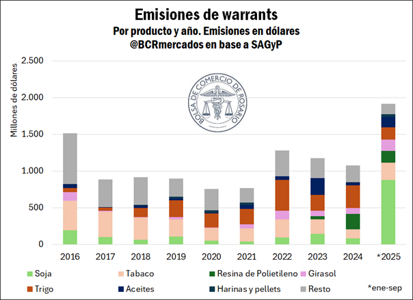 Este marco de modificaciones fue un factor que colaboró en darle un nuevo impulso al financiamiento con warrants en el país en 2025. Sumando las emisiones de warrants en dólares y en pesos (convertidas estas últimas al tipo de cambio comprador promedio mensual en cada dato mensual de emisiones), los primeros nueve meses del año dejaron un financiamiento en warrants superior a los US$ 2.050 millones. Esto representó un crecimiento interanual del 116%, duplicándose con creces. Cerca del 93% del financiamiento otorgado en warrants fue emitido en dólares en este 2025. El 2025 podría finalizar con un récord de financiamiento de warrants en más una década.