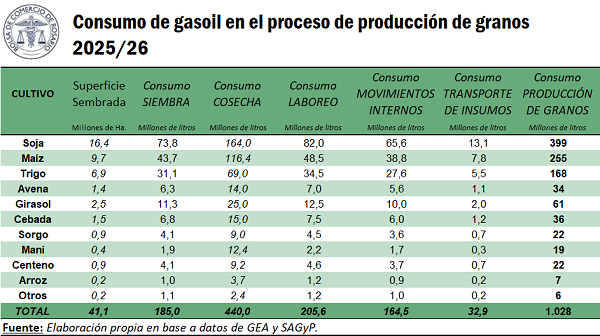 En base a datos de superficie sembrada con los distintos granos, y teniendo en cuenta consumos promedio para actividades específicas: siembra, cosecha, laboreo, movimientos internos y transporte de insumos, puede realizarse una estimación sobre el consumo de gasoil que se realizaría durante el proceso de producción en la campaña 2025/26. Las fuentes de datos son la Guía Estratégica para el Agro (GEA) de la BCR y la Secretaría de Agricultura, Ganadería y Pesca de la Nación (SAGyP).