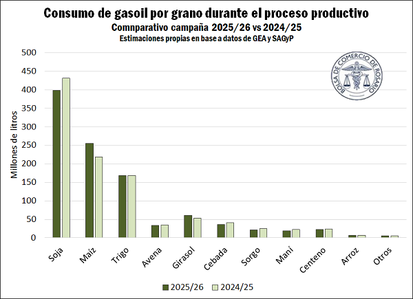 Por la menor superficie que se espera en la siembra de soja, el consumo de gasoil para el proceso productivo de este grano caería un 8%, a 399 millones de litros. Como contrapartida, la gran superficie que se sembraría con maíz a causa de la buena disponibilidad hídrica y la disipación parcial de los temores causados por la chicharrita provocarían un aumento del 17% entre campañas para el uso de gasoil del cereal, que alcanzaría los 255 M l. También se espera un incremento importante en el consumo del girasol, cuya área sembrada podría alcanzar máximos en un cuarto de siglo, mientras que se estiman disminuciones interanuales en el consumo de cebada, sorgo, maní y centeno. Por último, tanto el trigo como el arroz se mantendrían en registros similares a los de la campaña previa.