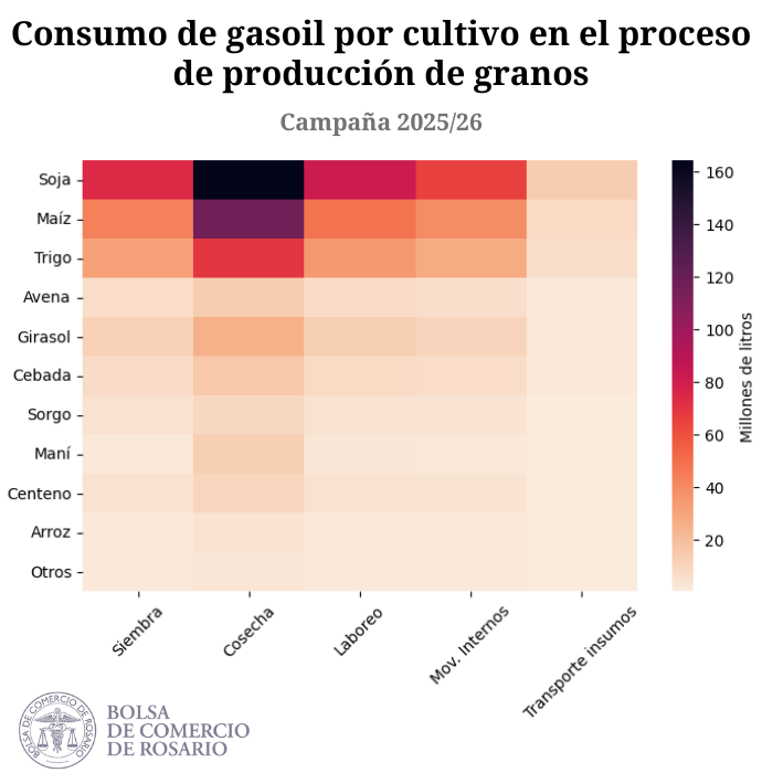 De este modo, el consumo de gasoil en el proceso productivo para la campaña 2024/25 podría ubicarse en 1.028 millones de litros, en línea con el ciclo pasado, pero con cambios en la composición interna de cuánto es insumido por cada grano.