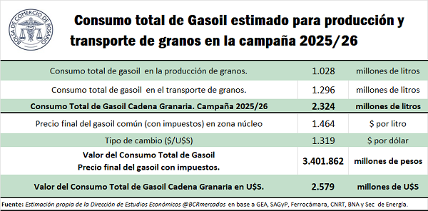 Con estas cotizaciones, en la campaña 2025/26, la cadena granaria consumiría gasoil por un valor de U$S 2.579 millones.