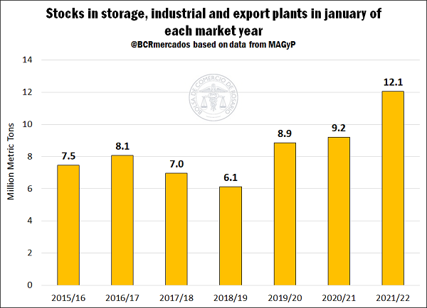 As the last days of December went by, the progress of the wheat harvest kept a good pace. According to the latest survey by the Argentinian Ministry of Agriculture, Livestock and Fisheries (MAGyP, for its Spanish acronym), threshing machines have already moved forward over 99% of the total 6.7 M ha. This record is just 2 percentage points higher than last year. At the same time, due to the good results in terms of yields, production is approaching historical record levels. This can be partially seen in the high volume of stocks in storage, industrial and export plants shown by data for January 2022, which with 12.1 Mt as of January 2022 is about 2.9 Mt above the record for last year. Furthermore, this volume exceeds the average of the last 5 years (7.8 Mt) by approximately 53.6%.