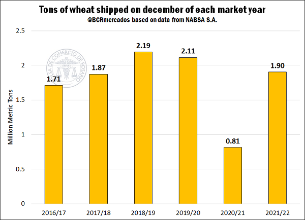 On the other hand, according to data by the shipping agency NABSA S.A., grain shipments in December totalled 1.9 Mt, exceeding the December 2020 record by 134%, partly due to union conflicts that affected shipments over that month and partly thanks to the productive recovery of the season in course. Thus, if we compare what happened in previous crops last month, it can be said that it exceeded 2016/17 and 2017/18, while it remained below the following two.