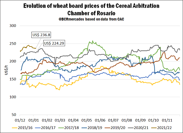 Regarding the evolution of the board prices granted by the Cereal Arbitration Chamber of Rosario (CAC, for its Spanish acronym) and in a year-on-year comparison, an increase of US$ 12.5/t is observed, that is, a 6% rise compared to the same moment of the previous year. In this way, if we consider the historical values since the 2012/13 crop season, the cereal is 8% behind the maximum registered in mid-May 2018 (US$ 258/t).