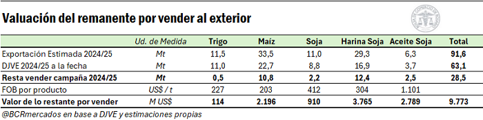 Si se valúa la mercadería que resta vender al exterior de la campaña 2024/25 al precio FOB de exportación vigente el día viernes, se estima que el valor total del trigo, el maíz, y el poroto, la harina y el aceite de soja que resta vender al exterior para cumplir con el programa exportador estimado para la campaña alcanza US$ 9.770 millones. Vale recordar que el Decreto publicado en el Boletín Oficial pone un límite a las operaciones beneficiadas por la eliminación temporal de retenciones de 7.000 millones de dólares en ventas al exterior.