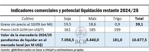 Del total, al 17 de septiembre ya se comercializaron 77,5 Mt, de las cuales 68,7 millones de toneladas ya tienen precio en firme. Si al volumen de granos que resta comprar a la industria y a la exportación le sumamos el volumen de mercadería comprada que a la fecha no se le ha puesto un precio en firme, promediando septiembre el stock de trigo, soja y maíz que o bien no había sido vendido o bien aún permanecía con precio pendiente de fijación ascendía a 39,1 millones de toneladas. Valuando este tonelaje al precio de la Cámara Arbitral de Cereales de Rosario del lunes 22/09 el monto pendiente de pagarle al vendedor doméstico del grano asciende –teóricamente- a US$ 10.678 millones de dólares.
