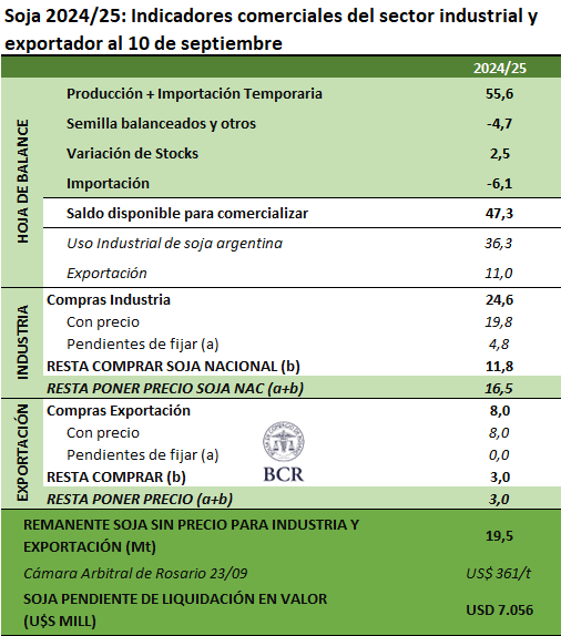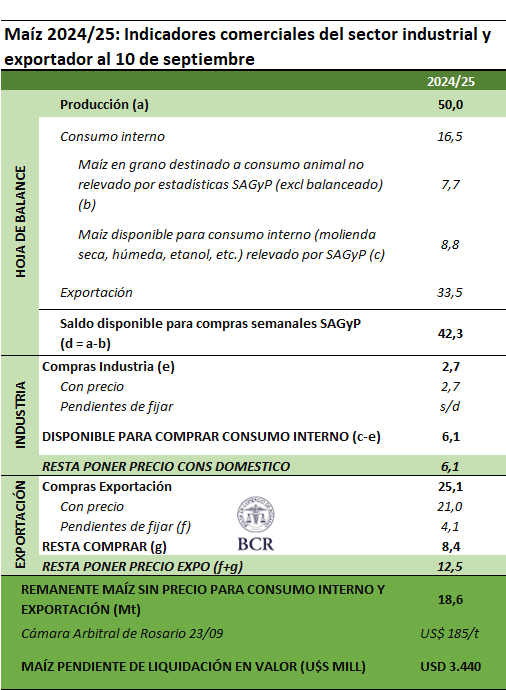 Siguiendo con el maíz, para la campaña 2024/25 se estima un consumo interno total de 16,5 Mt, de las cuales 7,7 Mt se destinan a consumo animal pero no es relevado por las estadísticas de SAGyP. Así, el maíz destinado a consumo interno que se estima será absorbido por el sector industrial -balanceados, molienda seca y húmeda, producción de bioetanol- recogido en las estadísticas de compras semanales de SAGyP totaliza 8,8 Mt. El sector industrial lleva adquiridas 2,7 Mt de esas 8,8 Mt totales, lo que deja un saldo de 6,1 Mt que este sector deberá adquirir en el mercado local. La exportación, por su parte, se espera absorba otras 33,5 Mt destinadas al mercado externo. De éstas, ya adquirió 25,1 Mt (de las que 21 MT tienen precio en firme), por lo que restan comprar para despachar al exterior 8,4 Mt. Sumando el grano que resta comprar tanto a la industria como a la exportación más el volumen ya adquirido pero que a la fecha sigue pendiente de fijación, se tienen al 17 de septiembre 18,6 Mt de maíz al que resta ponerle precio. Valuando esta mercadería al precio CAC Rosario en dólares del 22/9, el monto pendiente a liquidar para las compras en el mercado local de maíz destinado a la industria y exportación asciende a un total de USD 3.440 millones.