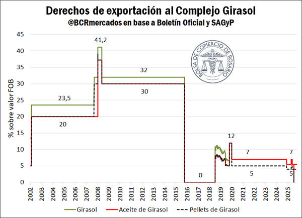 Cuadro actualizado con la evolución de las alícuotas aplicables a la exportación de productos agroindustriales seleccionados, entre los que se encuentran los principales granos y subproductos que produce y embarca Argentina.