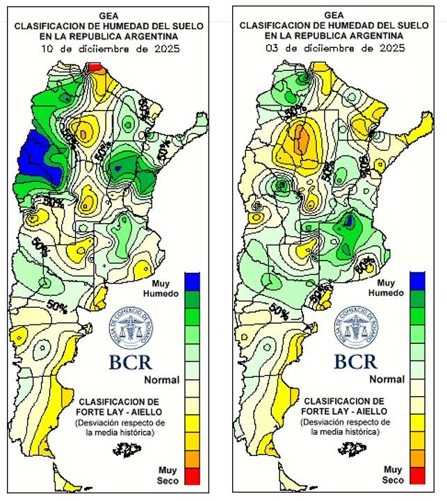 Con la mitad de los maíces tempranos en plena floración y otro 45% en panojamiento, los técnicos coinciden: el 90% del cultivo esta de muy bueno a excelente. Pero también advierten que hay zonas donde una lluvia empieza a ser más que necesaria para asegurar altos potenciales justo ahora, cuando el cultivo define su rinde. “Los maíces están bien. Sufren durante el día por la baja humedad relativa, pero se recuperan bárbaro a la tardecita y durante la noche. Por ahora vienen bancando la falta de agua. Pero si no cae una lluvia importante este fin de semana, los primeros lotes que ya entran en el período crítico van a sentir el golpe y resignar potencial”, advierten desde Bigand, un diagnóstico que se replica en Marcos Juárez. En contraste, desde los alrededores de Venado Tuerto reportan que no ven síntomas de estrés ni siquiera en las horas pico. “El maíz, por ahora, sigue aguantando bien”.