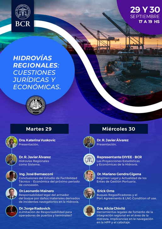 Jornadas sobre Hidrovías Regionales como verdaderos sistemas de transporte internacional o Interjurisdiccional de mercaderías por agua. Se analizará el estado actual de estas infraestructuras de transporte regional en el continente. Sus aspectos jurídicos sobre la responsabilidad del transportista del puerto del Ente de Gestión y la nueva legislación. Asimismo los aspectos económicos de la Hidrovía y el estado actual de la futura concesión del dragado y balizamiento en Argentina.
