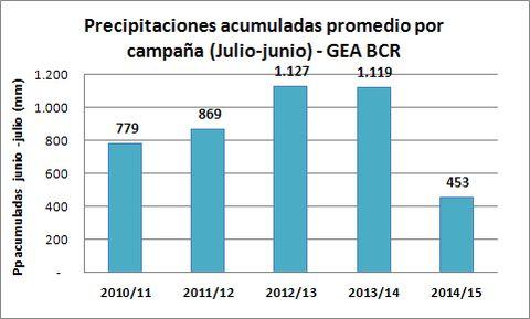 Es interesante efectuar el análisis en función del año agrícola (julio-junio). Se podrá apreciar que el mayor acumulado ocurrió en la campaña 2012/13. Justamente, el rinde del maíz copia el gráfico de precipitaciones anuales, mientras que los rindes de trigo y soja se mantienen más estables ante los diferentes valores acumulados de lluvias.