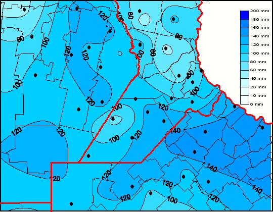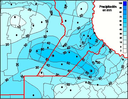 Hay una franja más estrecha que recibió precipitaciones por encima de los 50 mm, que va desde Canals (Córdoba), Maggiolo, Chovet, Labordeboy, hasta Rojas(Buenos Aires). También la zona cercana de Rosario, Zaballa y Alvarez, recibió más de 50 mm.
