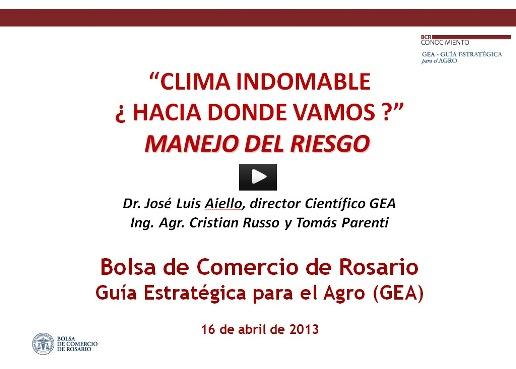 “Este año tendremos un escenario climático bajo condiciones neutras y con una Niña débil, lo que significará que no será el mejor año pero sí es una condición aceptable para el desarrollo de la nueva campaña”, aseguró José Luis Aiello, director científico de la Guía Estratégica para el Agro (GEA) de la Bolsa de Comercio de Rosario, durante la videoconferencia que compartió este martes. Bajo el título “Clima indomable: ¿Hacia dónde vamos?”, Aiello compartió una charla junto con los ingenieros agrónomos de GEA, Tomás Parenti y Cristian Russo, en el marco de la publicación de 300 informes semanales de la Guía Estratégica para el Agro. El Dr. Aiello analizó el escenario actual de clima enrarecido y mucha volatilidad. “El pronóstico muestra una continuidad de esta volatilidad que se atribuye a causas como el cambio climático, sobre todo por efectos antropogénicos.“La atmosfera en los últimos cien años fue registrando mayores temperaturas y subió en un grado su temperatura como lo hizo hace mil años. En las próximas décadas, esto producirá más ciclos asociados a Niños que de Niñas, y también mayor cantidad de eventos y anomalías climáticas”, aseguró. Con este escenario, el especialista insistió en la importancia de analizar las variables más importantes que permitan generar un escenario para la planificación de siembras. “Cualquier agente del sector agropecuario puede considerar variables a corto, mediano y largo plazo, y así operar sobre las inestabilidades”. En relación a la próxima campaña, destacó el hecho de no tener un evento de Niña intenso, sino de neutralidad. “Los impactos se deben a procesos de gran escala, efectos regionales y efectos en escalas cortas. Y para este año, la gran escala da un escenario de neutralidad a Niña débil”. Efectuó algunas consideraciones para la planificación de las siembras 2013/14: “Es muy importante analizar lo que pasó en los últimos 30 años y planificar con patrones normales considerando cada cultivo, región y riesgo climático”. Para ver la videoconferencia completa, hacer click en el siguiente link: http://www.youtube.com/watch?v=kMv1Hta6q8o http://youtu.be/kMv1Hta6q8o
