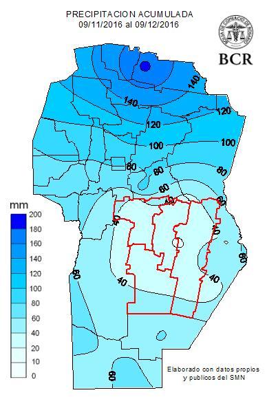 En los departamentos de Unión, General San Martín, Juárez Celman y Tercero Arriba, tomando exactamente el total de las lluvias del 9/11 al 9/12 hay un total de 30 a 40 mm de los 100 y 120 mm que marcan las medias históricas para igual periodo. Las últimas tormentas que se esperaban en este último fin de semana, terminaron yéndose hacia la parte más oriental de la provincia, alcanzando también a Santiago del Estero.
