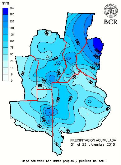 Hasta ahora el ranking de diciembre, en lo que respecta a las lluvias, lo encabezan Canals con 127,4 mm, Hernando 104,6 mm, Irigoyen de 101,6 mm. Para la región pampeana los acumulados de diciembre son los siguientes: