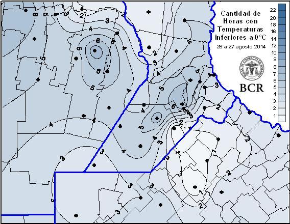 Además, se destaca la intensidad del evento graficando el período de horas en el cual la temperatura se mantuvo por debajo de 0ºC, entre 4 a 6 horas en las provincias de Santa Fe y Córdoba. Durante la jornada de hoy, el viento comenzará a rotar al sector norte, de manera muy paulatina, por lo que mañana continuarán los bajos registros térmicos y la probabilidad de heladas, pero de manera más aislada en la región núcleo .Los técnicos de la región de Córdoba y del centro sur de Santa Fe están preocupados por el nivel de daño que puede ocasionar el fenómeno. Los cuadros de trigo, luego de la intensa variación térmica y la falta de lluvias, quedaron muy vulnerables a heladas. El nivel de daño foliar que se podría observar en los próximos días puede ser grave en algunos cuadros de la región.