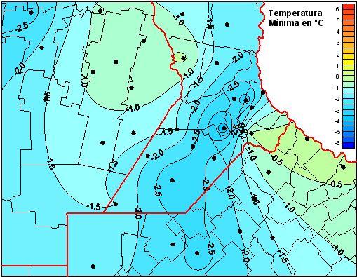 En promedio los valores mínimos oscilaron entre 0 y 3 ºC bajo cero, mientras que se destacan los registros observados en la localidad de Bigand, en la provincia de Santa Fe, con 3,8ºC bajo cero. En Zavalla alcanzó 3,4ºC bajo cero, y en Lincoln, provincia de Buenos Aires, se midió 2,7ºC bajo cero.
