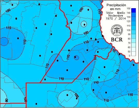 En la zona núcleo las medias estadísticas de noviembre, tomando el período que va de 1970 a 2014, indican promedios en torno a los 100 y 110 mm. Hasta la semana pasada, como se observa en los gráficos de los acumulados del 1ro al 13 de noviembre, las lluvias, en general estuvieron entre los 60 y los 80 mm. En muchas localidades, con las lluvias moderadas que se esperan esta semana, los acumulados ya se acercarían a los esperados para el final del mes.