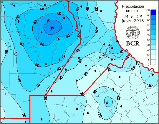 Cómo se observa en la imagen de la región núcleo, en el este de Córdoba se alcanzaron marcas de 70 mm tan sólo en cuatro días. Para junio es algo muy inusual. Recordamos que las medias históricas del mes están entre los 40 y 50 mm. En las zonas que recibieron lluvias en torno a los 50 mm o más la situación es grave. Esto significa que hay napas por encima de los suelos, caminos otra vez intransitables, imposibilidad de entrar en los lotes y de seguir con las siembras, cosechas o barbechos por los próximos 10 días. Los técnicos en la zona núcleo alertan de que los últimos lotes sembrados con trigo podrían perderse. También, con esto, la última tanda que falta por sembrar con trigo podría suspenderse. El correr de los días permitirá verificar en que magnitud.Por todo esto es que hay temor ante la nueva posibilidad de lluvias. Sin embargo, nuestros meteorólogos dicen que el panorama es alentador. Para jueves o viernes, lejos de esta gran tormenta, se esperan lluvias de entre 15 y 30 mm. En la zona núcleo el rango iría de de 15 a 20 mm. Las lluvias llegarían a Córdoba con 5 a 10 mm, no más. A diferencia del fenómeno predecesor, que provino desde el sur de Brasil, esta vez el frente ingresará por el sudeste. Por eso su recorrido será en dirección opuesta, y con una intensidad mucho más moderada. El frente desplegara su mayor acción entre el noreste de Buenos Aires, sureste de Santa Fe y el sur Entre Ríos. Su eje de acción estará en la desembocadura del Río de la Plata. Luego se desplegará, durante el viernes y sábado, en dirección al noroeste.