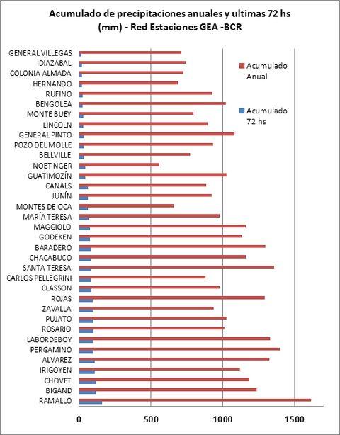 Finalmente entre el viernes 31 y el 3 de noviembre se registraron lluvias generalizadas en toda el área GEA. Los mayores acumulados se encuentran en la franja este del sur de la región núcleo. Se destacan las localidades de Ramallo que acumuló más de 150 mm, Bigand con 120 mm, Chovet con 119 mm, Iroyen y Alvarez con 110 mm. También se destacan las localidades de Pergamino, Labordeboy, Rosario y Pujato con marcas de 100 mm.