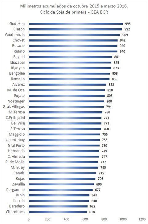 Pasaran unos cuantos años antes de que el año 2015 pierda su título del “más llovedor” por los 850 mm que dejó en los seis meses de crecimiento de la oleaginosa. Así y todo, este año lo siguió muy de cerca. En todo el ciclo la soja recibió apenas 60 mm menos que en la campaña pasada. En seis meses, l as zonas de Godeken o Clason alcanzaron casi los 1.000 mm, que son las lluvias normales de un año (ver gráficos por localidad). Le sigue Guatimozin, donde el acumulado es de 970 mm. Esto dejó severos daños en extensas áreas. Las lluvias superaron máximos históricos mensuales, o estuvieron muy cerca de los mismos.