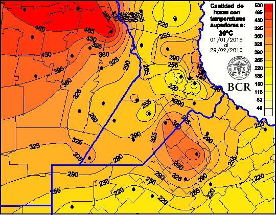Desde principios de octubre, el registro promedio de las 36 estaciones de la Bolsa, ubicadas en el área núcleo, muestra un volumen de agua de 790 mm sobre la región núcleo. Teniendo en cuenta que las necesidades de agua en el ciclo de soja son de 450 a 650 mm , s e puede decir que le sobró, pero analizando con más detenimiento, hubo mucha agua en momentos perjudiciales para el cultivo, como en la implantación. También escaseó en momentos claves del verano, cuando las temperaturas, sobrepasaron por lejos los límites óptimos del cultivo ( 25 y 30ºC) . Durante enero y febrero, la cantidad de horas que las temperaturas estuvieron por encima del umbral de los 30 ºC resultaron en un 54% superior respecto al 2015. Hubo localidades que se destacan, como Noetinger, Pozo del Molle y Colonia Almada, donde la cantidad de horas con temperaturas mayores a 30 ºC, llegaron a 465 sobre un total de 1440 horas. Hubo también un cambio rotundo en las temperaturas mínimas. El régimen térmico de este año mostró diferencias contundentes y afectó a los cultivos. En la comparación, en enero y febrero del 2015, los mínimos estuvieron en 115 horas mientras que este año, la base arranca en 220 horas.
