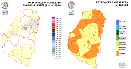 AVANZA LA SECA EN ENTRE RÍOS Nuevamente las precipitaciones han sido muy pobres en la provincia de ER. En el mapa se observa una franja mejor provista que desde el noreste de Villaguay se despliega hasta Concordia y las vecindades de Federación. Algunos chaparrones de entre 15 y 20 milímetros se dieron en forma más puntual en el departamento Paraná. En el resto de la provincia, las lluvias fueron muy ligeras, en forma de lloviznas dejando registros inferiores a los 5 milímetros. Luego del pasaje frontal que dejó estas precipitaciones, se ingresó al fin de semana con vientos rotando al sector sur sudoeste, imponiendo un marcado cambio de ambiente. El cambio de masa de aire se hizo sentir con rigor durante lunes y martes. Si bien no se registraron temperaturas mínimas por debajo de cero, si se observaron registros de entre 2°C y 3°C, lo cual puede haber dejado alguna helada débil en sectores bajos. Por cierto el avance de esta masa de aire polar es inusual para la época y su efecto se hizo sentir hasta la provincia del Chaco. Las eventuales heladas que pudieron haberse registrado en el centro norte de la región pampeana, se adelantaron casi un mes a la fecha media para el sector. Las perspectivas de lluvias para el resto de la semana y los primeros días de la próxima, son muy pobres. La circulación del nor noroeste, no esta incorporando humedad suficiente como para proyectar cambios destacados. Eventualmente la última semana de abril, puede traer algunas precipitaciones, sin embargo las lluvias del mes quedarán muy por debajo de lo normal. El balance hídrico del primer metro de suelo, responde con un lógico aumento de las áreas en sequía. Son muy reducidas las zonas que pueden estar mostrando una disponibilidad de humedad regular. Estas reservas se encuentran muy por debajo de los valores que debería presentar la provincia en esta época. Es común que a mediados de abril, gran parte de la provincia presente suelos cercanos a la saturación, lo cual generalmente genera un contexto aliviado para el inicio de la fina. Como decíamos la semana pasada, estas deficitarias condiciones de humedad no adquieren su real dimensión dado que es época de cosecha. Las condiciones meteorológicas actuales son muy favorables par que el paso de la recolección y su almacenamiento sea muy rápido. Es interesante observar como la zona del delta que corresponde al departamento Victoria, se encuentra en estado de sequía. Es decir los incendios, encuentran mucha materia seca para potenciarse. Por otra parte las condiciones meteorológicas actuales son muy favorables para que el humo procedente de la quema, se estratifique. El sistema de alta presión que domina todo el centro norte del país mantiene en las capas bajas la polución generada por los incendios. Debido a que el humo no se fumiga hacia capas más altas de la atmósfera, los problemas de visibilidad se potencian. La circulación del norte y noroeste genera una deriva hacia el noreste de BA. Las condiciones meteorológicas actuales experimentarán pocas modificaciones en los próximos días, por lo que el problema será persistente mientras perduren los incendios.