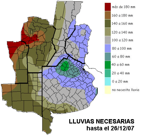 BUENA COSECHA Y MAL CONTEXTO CLIMÁTICO La cosecha de trigo se intensifica sobre la franja central de Córdoba, Santa Fe, Entre Ríos y norte de Buenos Aires. Esta tarea esta ligeramente atrasada respecto de la misma fecha del año pasado debido a que la primavera fría prolongó el desarrollo del cultivo mejorando los rendimientos. Se estima que en esta vasta zona ya se ha recolectado un 75 por ciento de la superficie sembrada. Los rendimientos son superiores en un 15 o un 20 por ciento a los valores normales. Recordamos que este núcleo triguero no sufrió el duro impacto de las heladas tardías. Las abundantes lluvias de octubre y las temperaturas frescas que se proyectaron al mes de noviembre, pusieron el marco climático que justifica esta excelente producción. Esta notable performance del núcleo triguero norte de la región pampeana, compensa parcialmente la significativa merma de producción que ocasionaron las heladas tardías en el sur de Buenos Aires. La siembra de soja de primera también va finalizando con algunos atrasos debido a la escasez de humedad superficial en algunas zonas y va comenzando la época de las siembras de segunda sobre rastrojo de trigo. En muchos casos habrá que esperar la ocurrencia de precipitaciones importantes para poder hacer una implantación adecuada. Esta condición se impone en la zona de la delegación Tandil, donde también se produjeron los daños más importantes por las heladas tardías. Actualmente las condiciones meteorológicas favorecen los desecamientos superficiales, afianzando el panorama complejo para la actividad agrícola. El sur de Santa Fe, el centro norte y el noroeste de Buenos Aires, donde las precipitaciones han sido copiosas, tienen mejores posibilidades para sobrellevar estas exigentes condiciones. La precaria clasificación de humedad que actualmente se generaliza sobre las zonas agrícolas de la región pampeana, es antagónica respecto de la que se observaba a principio de diciembre del año pasado. Para entonces la zona núcleo de la región pampeana ingresaba en un período donde el clima fue sumamente benigno para los cultivos de verano. Más allá de los corrimientos pluviales positivos extremos que se observaron en diciembre y marzo, el paso de los distintos cultivos por su momento de mayor demanda hídrica fue en general muy aliviado. El maíz padece la falta de agua en vastos sectores de la región pampeana y las perspectivas de corto plazo no aportan el agua necesaria para mejorar el paso de este cultivo. El clima se esta poniendo decididamente en contra de las aspiraciones de altos rendimientos para este cultivo. El mapa de lluvias necesarias que acompaña este texto, representa la demanda para recomponer las reservas hasta un nivel óptimo. Esta demanda supone que la cobertura es una pastura con consumo permanente a lo largo de todo el año. Teniendo en cuenta estas consideraciones, debe considerarse que esta demanda es la máxima atendiendo el actual estado de los cultivos. Es decir muy posiblemente los cultivos puedan arreglarse con menos, sin embargo la necesidad de precipitaciones es perentoria. Lamentablemente la mayor parte de la región pampeana no recibirá precipitaciones de importancia como mínimo hasta el próximo jueves. Las lluvias previstas del viernes para el sábado son mínimas considerando la remanada. A pesar de que el mapa puede estar sobredimensionando los requerimientos hídricos, pone en contexto la gravedad de las deficiencias de humedad que presentan los suelos. El panorama es complicado y el alivio recién puede llegar entre el 20/12 y el 27/12, siempre que ingrese aire de origen tropical y no se recircule el aire seco dominante en la región pampeana.
