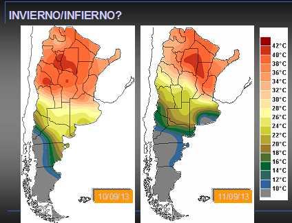 Durante el último fin de semana comenzó a observarse una fuerte circulación del sector norte. La masa de aire que se fue incorporando a la región pampeana tenía como origen las zonas secas del NOA y de Santiago del Estero. La misma no encontró resistencia en su avance hacia el sur. Por otro lado la presencia de un sistema de alta presión sobre el continente durante el lunes generó un calentamiento aún mayor de la masa de aire cálido. Esta configuración devino en el despliegue de temperaturas máximas que ya no pueden catalogarse de inusuales, sino que han marcado nuevos valores record en gran parte del centro norte del país. En la ciudad de CB, por ejemplo la máxima del martes superó los 40°C, lo cual claramente no ayudo a sofocar los graves incendios que afectan los valles serranos. Por otra parte hacia el sur y sobre la zona núcleo, los valores fueron más bajos pero igual quebraron el record de las estadísticas de máxima de septiembre. Es decir el final del invierno durante el martes fue propiamente un infierno. El miércoles el aire más caliente comenzó a ser desplazado hacia el este y el noreste y fue entonces el este del NOA, el NEA y gran parte de la Mesopotamia las zonas que se llevaron la peor parte. Este movimiento del aire cálido hacia el este noreste, se observa con claridad en los mapas de temperatura máxima del martes y miércoles. Desde ayer el avance de aire más fresco desde el sudoeste, favoreció el aplacamiento de las rigurosas condiciones térmicas que condicionaban el auxilio de las zonas incendiadas en CB y SL. También hay que considerar que estas altas temperaturas seguramente han impactado de manera muy contundente sobre los exigidos trigales de SF y CB, seguramente resintiendo las sementeras del norte de BA y el sudoeste entrerriano, donde al menos la disponibilidad de humedad era mayor. El sudeste de BA sigue quedando más protegido y de alguna manera comienza a definirse como el reservorio de triguero de esta campaña. Para el núcleo triguero tributario de Rosario, principalmente hacia el oeste, la situación se presenta grave. Las perspectivas de precipitaciones no parecen ser generosas o dicho de otro modo queda lejos de la demanda exigida por las sementeras. Para CB, la posibilidad de sembrar maíces tempranos comienza a esfumarse. Los productores que por cuestiones de manejo deban implantar este cultivo deberían ir a fechas tardías, más seguras dentro de este contexto climático. Estas dos jornadas de temperaturas extremas han promovido desecamientos superficiales destacados, poniendo presión sobre la oferta de agua de septiembre, la cual sobre el oeste no es suficiente como para revertir la seca. Esto plantea un panorama donde es muy probable que la decisión de los productores muestre una inclinación hacia la soja, con lo cual se justificaría los números que hoy estiman un crecimiento importante de la superficie sembrada con la oleaginosa. El clima y los costos de este cultivo frente al maíz parecen estar sesgando el inicio de la campaña. Es posible entonces que la campaña que iniciamos logre una superficie record en la siembra de soja.