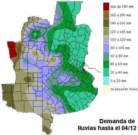 El más que mejorado andar pluvial del mes de noviembre ha ordenado el avance de las siembras de soja. Son muy reducidas las zonas que hoy por hoy no pueden progresar por problemas de falta de humedad en la cama de siembra, en todo caso ha habido problemas de anegamientos de lotes, principalmente en ER o el centro de SF, donde incluso se están analizando algunas resiembras. No obstante este favorable cambio, aún se mantienen zonas donde el perfil no se ha recuperado en su plenitud y justamente es allí donde la demanda se mantiene en niveles elevados. Para constatar los requerimientos hídricos podemos estimar cuanta lluvia sería necesaria para que una pastura alcance o mantenga niveles adecuados de reserva en el primer metro de suelo. El escenario resultante es una hipótesis de máxima demanda, la cual seguramente no es tan elevada para las siembras, sin embargo permite identificar sectores que potencialmente se encontrarían más vulnerables a deficiencias hídricas ante una oferta empobrecida o ante un pulso seco. En primer lugar se aprecian claramente los sectores mejor posicionados para el devenir de las próximas dos semanas. En este sentido, ER, el centro de SF y el sudeste de BA corren con ventaja porque sus demandas no quedan lejos del alcance del corto plazo y son valores muy razonables para la estadística. El corredor que define un requerimiento más importante es el que se extiende por el sur de CB, desde Río Cuarto, hasta llegar al sur de SF, en la zona de influencia de Venado Tuerto. En segundo lugar, el noroeste de BA y gran parte de LP, también reclaman lluvias de importancia. Recordamos que estas estimaciones son calculadas para lograr un comportamiento óptimo del perfil, que no se satisfaga esta demanda no necesariamente quiere decir entrar en sequía. A partir del domingo o cambiando para el lunes reaparecen las precipitaciones. Las mismas podrían ubicarse en sectores donde las lluvias son requeridas con más premura. No se descartan registros destacados para zonas del norte de LP, noroeste de BA, sur de CB y sur de SF. El período de inestabilidad se extendería hasta el martes inclusive y para entonces las precipitaciones se habrían extendido a buena parte de la región pampeana. Por lo pronto, los máximos pluviales tienen tendencia a configurase sobre zonas corridas hacia el oeste, pero en general es razonable esperar lluvias generalizadas entre las últimas horas del domingo y el martes, las cuales alternativamente cubrirían gran parte de la región pampeana, con buenas posibilidades de extenderse hacia las zonas agrícolas del NOA. Las condiciones ambientales que se esperan para las próximas jornadas ya son propias de verano, las lluvias atenuarán el crecimiento de las temperaturas máximas que se observarán durante el fin de semana.