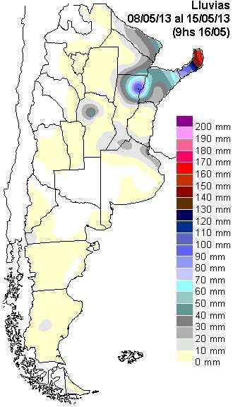 La última semana se presentó inestable en la las provincias del centro y el norte de BA, y si bien no se observaron sistemas precipitantes destacados, desde el miércoles 8 hasta el último martes, se sucedieron jornadas húmedas donde fueron frecuentes las lloviznas y los pasajes de nubosidad que se fueron alternando en gran parte todo el territorio. El resto de la masa de aire húmedo que dominó gran parte de la región pampeana durante el comienzo de mayo, tendió a concentrarse en la Mesopotamia. Esto se destaca al observar el mapa de lluvias acumuladas, con máximos sobre el noreste de SF y en general sobre Corrientes y Misiones. Se nota un corte abrupto al desplazarnos hacia las zonas agrícolas chaqueñas y del NOA, donde la seca se Cambiando del martes para el miércoles reaparecieron las lluvias, en este caso con mayor cobertura sobre la zona de influencia del estuario del Río de la Plata, el sur de SF, norte de BA y sur de ER Considerando lo descripto, la semana que ha cerrado hoy no ha sido todo lo favorable que se esperaba para el oreado de los suelos. Aunque seguramente la condición de piso ha mejorado es probable que en vastos sectores la cosecha recién este comenzando a ganar continuidad durante esta semana. De todas maneras, instituciones privadas como la Bolsa de Cereales de ER, han evaluado que la cosecha de primera ya ha terminado en esa provincia, con un promedio de rendimiento superior al de campañas previas. Algo similar ocurre en el norte de BA,SF y CB, provincia, esta última, donde los rindes son más irregulares, excelentes en el norte de los departamentos Marcos Juárez y Unión. En el corto plazo toda la atención se pone en el final de cosecha. En este sentido posiblemente el avance de la masa de aire polar y seco sea muy favorable. No aparecen motivos de preocupación en el mediano plazo en cuanto a la posibilidad de que se reaparezcan sistemas precipitantes capaces de sostener excesos hídricos. No se descarta que la inestabilidad del domingo nuevamente se traduzca en algunas lloviznas, sin embargo enfatizamos que el patrón conducente no proyecta el despliegue de lluvias destacadas en la zona núcleo. Considerando las actuales condiciones hídricas, es razonable atender la situación de aquellos productores que no pueden avanzar a la velocidad deseada en las tareas de cosecha, sin embargo, está claro que gran parte de la franja central ha acopiado la humedad necesaria como para decidir las siembras de la fina. Es decir, no parece ser esta la variable que limite el crecimiento del área sembrada en Argentina. De acuerdo al análisis que podemos hacer de la disponibilidad de humedad, el aumento o no del área implantada de trigo quedará limitada a la confianza que los productores pongan en las nuevas medidas del gobierno, es decir, se pondrá a prueba el estímulo que éstas han provocado. Esto se debería notar ya a comienzos de junio, dado que gran parte de la zona tributaria de Rosario, tiene fechas de óptimas de siembra en esta segunda quincena de mayo.
