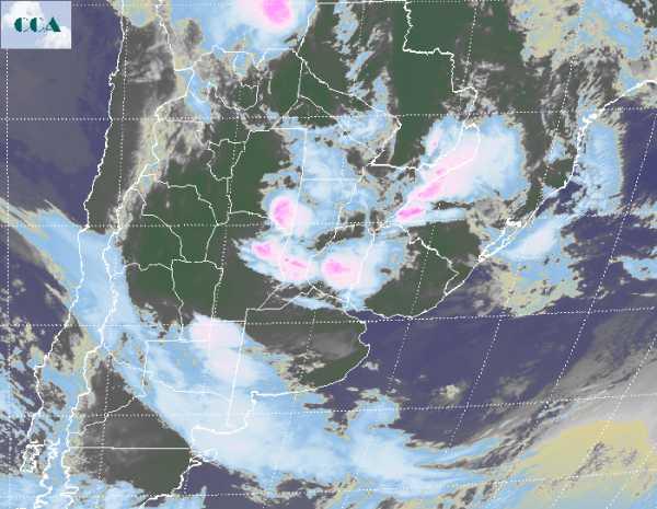 Durante la jornada de ayer, mientras el tiempo se mantenía bueno con cielos mayormente despejados en gran parte del sur y el oeste de la región pampeana, el mal tiempo se concentraba con precipitaciones y algunas tormentas en las provincias de SF y ER, marginalmente afectando el este de CB y el norte de BA. Esa situación no ha variado significativamente al tiempo que desde el sudoeste comienza a ingresar un sistema frontal que fortalecerá las condiciones de inestabilidad, generalizando las lluvias sobre las provincias de LP y BA. La imagen satelital presenta la actividad asociada a un sistema de baja presión ubicado sobre el centro este de la región pampeana. Dado que esta perturbación actúa sobre una masa con muy alto contenido de humedad, los movimientos de ascenso promovidos por la baja presión facilitan la condensación y el desarrollo de celdas de tormenta. Las mismas se aprecian en el este de CB, sudeste de Santiago, centro sur de SF, ER, este de Corrientes y Misiones. Trazando una línea imaginaria que une estas celdas de tormenta se puede inferir el borde más activo del centro de baja presión. Sobre el sudoeste de la región a ingresado el frente y la banda nubosa asociada está claramente organizada desde el sur de SL hasta el sudoeste de BA. Las celdas de tormenta son incipientes en el norte de LP, pero no se descarta que logren potenciarse en las próximas horas. La actividad atmosférica será generalizada y abundante a lo largo del día. Se espera que el frente vaya dejando precipitaciones sobre las provincias de BA y LP en su avance hacia el noreste. No están previstos montos muy destacados en esta zona. El centro oeste de CB podría recibir precipitaciones menores, mientras que el resto de la franja central acaparará los milimetrajes más elevados. El tiempo mejora rápido desde el sur desde mañana.