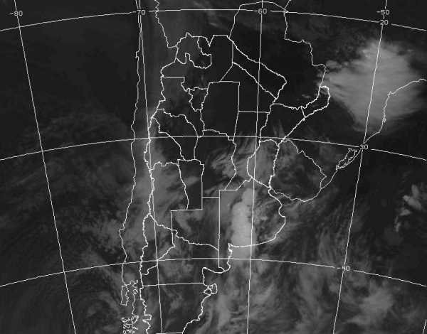 La imagen que se muestra es alternativa a la habitual, debido a problemas técnicos en la fuente de origen de provisión de las mismas (NOAA). Desde las últimas horas de ayer, se viene observando el avance de un sistema frontal desde el oeste. Las condiciones de humedad han favorecido el desarrollo de nieblas y neblinas en gran parte de la región pampeana, al tiempo que las temperaturas mínimas se mantienen por encima de los valores normales para la época incluso en el sur de la región pampeana. Desde el noroeste de BA se encadena una línea de tormentas que se extiende hacia el sur de la provincia en un eje virtual que podría unir las localidades de Junín y Bahía Blanca. En la imagen satelital, se aprecia la franja más activa del frente frío que avanza desde el oeste. En el procesamiento normal de la imagen, esta franja se observaría en colores que van desde el celeste a los violetas, es decir, son nubes de desarrollo vertical e indican la posibilidad de tormentas. De hecho los reportes desde las estaciones meteorológicas de la zona, validan esta situación. Se espera que esta línea de tormenta avance hacia el este, sin afectar con eficiencia las provincias del centro. Igualmente se observan coberturas nubosas sobre el centro sur de SF y ER. Se espera que durante el resto del día las tormentas afecten principalmente a la provincia de BA y en forma marginal el sur de ER. Es posible que algunas lloviznas alcancen el sur de SF, pero la trayectoria actual de las celdas de tormenta no parece indicar que las lluvias de importancia se desplieguen en la franja central. Con la estabilización de las condiciones del tiempo desde mañana, se prevé un moderado descenso de la temperatura. No se esperan condiciones rigurosas, ni tampoco heladas.