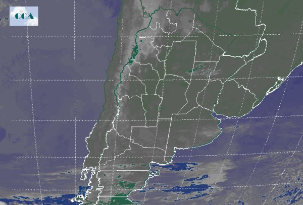 La jornada comienza con temperaturas mínimas similares al día de ayer ubicándose los registros más bajos del centro en dirección este bonaerense. Se reporta la presencia de nieblas y neblinas principalmente en las provincias del Litoral así como también en la franja este de BA. El recorte de la Imagen Satelital señala cielos prácticamente despejados en todo el centro norte del territorio nacional; obedeciendo al predominio de sistemas de alta presión que transfiere condiciones de estabilidad y muy buen tiempo en toda la región. En el extremo norte del NOA se presenta un desarrollo nuboso más destacado el cual puede arrojar algunas precipitaciones inclusive afectando el norte de las provincias de Cuyo; de acuerdo a la pobre disponibilidad de humedad en capas bajas de la atmosfera no se esperan importantes acumulados. Las condiciones meteorológicas continúan con ambiente templado a ligeramente cálido producto de temperaturas máximas que superan los 25 ºC - 27 ºC. El ingreso de un débil sistema frontal hacia la tarde de mañana produce una rotación de los vientos al sector sur con la consecuente atenuación en los valores de temperatura.