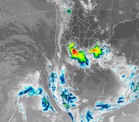 En el recorte de la Imagen Satelital puede observarse con claridad la extensión y desarrollo del sistema de mal tiempo que afecta por estas horas el sur de Córdoba, norte noreste de La Pampa, prácticamente toda la provincia de Buenos Aires y, desde la madrugada, se suma San Luis. La distribución de colores deja ver el posicionamiento del núcleo central asociado a tormentas de magnitud de gran desarrollo vertical sobre el extremo sur de Córdoba, situación que se repite en el sur del país vecino de Uruguay.