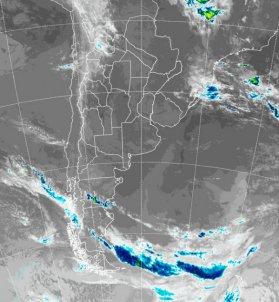 La foto de satélite no tiene demasiado para describir. En gran parte del centro norte del país dominan los cielos despejados, algunas nubes bajas se proyectan sobre el oeste del NOA desde Bolivia, mientras que una perturbación menor transita las provincias del sur de la Patagonia, dejando corredores de nubosidad pero con muy bajas chances de que los mismos provoquen precipitaciones.