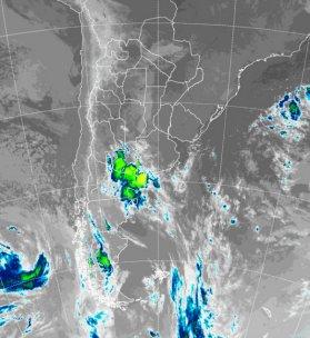 En la foto de satélite, se nota el despliegue de algunas nubes estratiformes que toman una franja que va desde la zona central del norte del país, hasta el oeste de la zona núcleo. Los cielos se presentan más despejados sobre el este. En tanto, el oeste y sur de LP, suman al este rionegrino y las vecindades de BA, configurando un área donde el frente logra provocar las primeras nubes con algo más de desarrollo vertical. Una segunda perturbación se despliega al sur sobre la Patagonia.